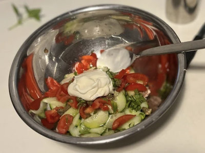 2.パスタを茹でてる間、冷房の効いたところで、サラダの具材をお好みサイズに切って、ボウルに集めて、マヨネーズ、オリーブオイルでしっかり十分に和えておく。