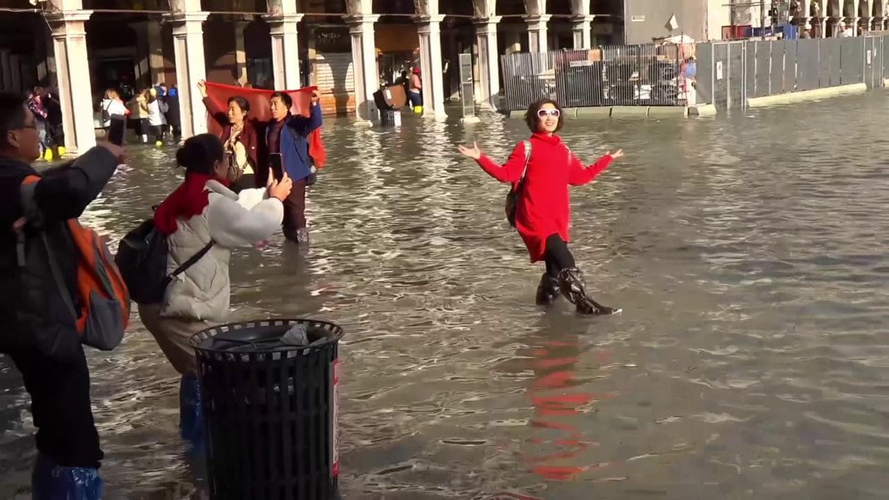 ベネチアはまだ緊急事態から脱していない。被害状況の把握に右往左往する地元民をよそに旅行者は楽しんでいるようだ。水を跳ね上げ、スマホを片手に映える1枚を狙う。