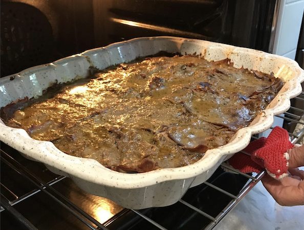 そのお肉をグルグル紐で巻き、アンチョビを加えたスープにオリーブオイルたっぷりで”蓋”をして、約3時間ほどじっくり煮込みます。取り出したお肉は、極薄スライスに、残ったスープを煮詰めてソースにし、肉・ソース・肉・ソースでミルフィーユ状にして、オーブンへドン!
