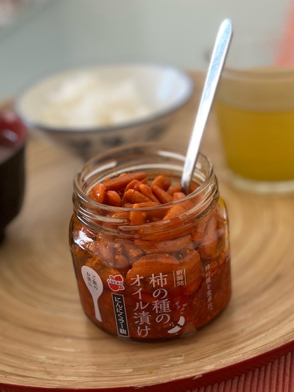 香ばしいパンの香りに包まれながら、ゴハンに「柿の種のオイル漬け」、納豆とお味噌汁を添えて。