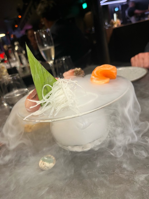 イギリス人、スペイン人、フランス人、ドイツ人、ポーランド人、そしてイタリア人が混ざるカオスなディナーは、煙に巻かれたお刺身、そしてマグロの3種タルタルなど、お刺身的魚介類から始まり、