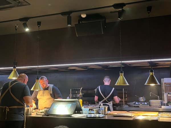 ごっついお兄さんたちが一生懸命汗だくで立ち働く様子が見えるオープンキッチン