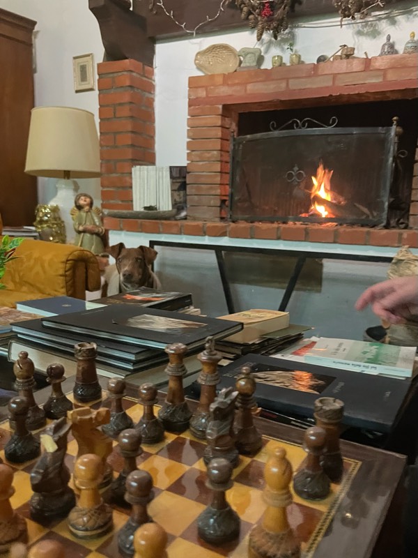 他のお客さんや犬と、お茶したり、アペリティーボしたり、おしゃべりしたり、ビリヤードしたり、チェスしたり。日本の元旦の午後っぽい雰囲気で、夕食の時間を数時間待ちました。