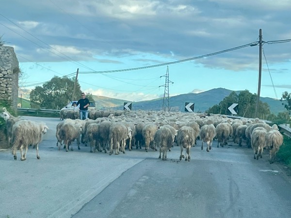パレルモから1時間半ほど、バイパス道路から対向車ゼロの怪しい県道に入ると、羊による通行止めに遭遇しました。