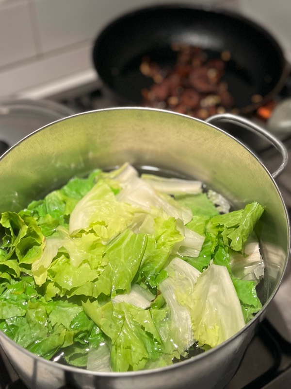 ②. お湯が沸いたら適宜塩を加え、切ったスカローラをバサっと入れ、蓋をして再沸騰してから3〜4分程度茹でる。