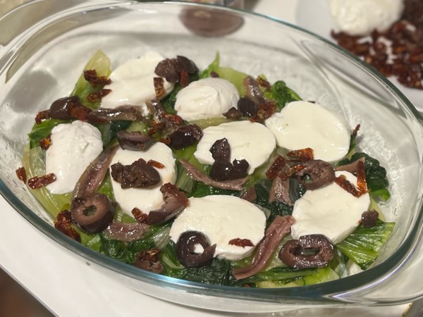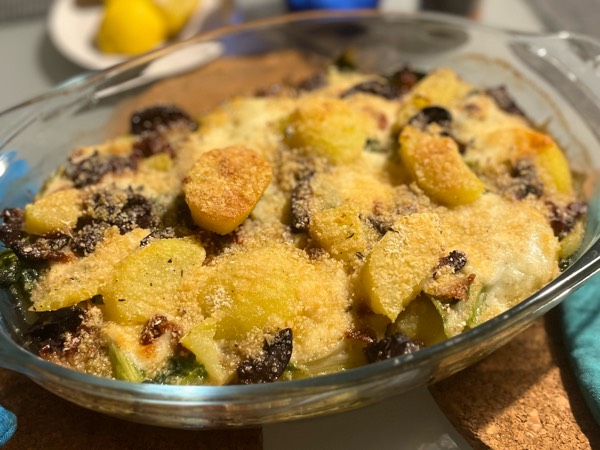 モッツァレッラがトロトロで、ジャガイモホクホク、スカローラがシャキシャキ。アンチョビ、オリーブ、ドライトマトの塩気と酸味と旨みで、まー美味しい一品にー。