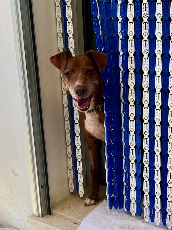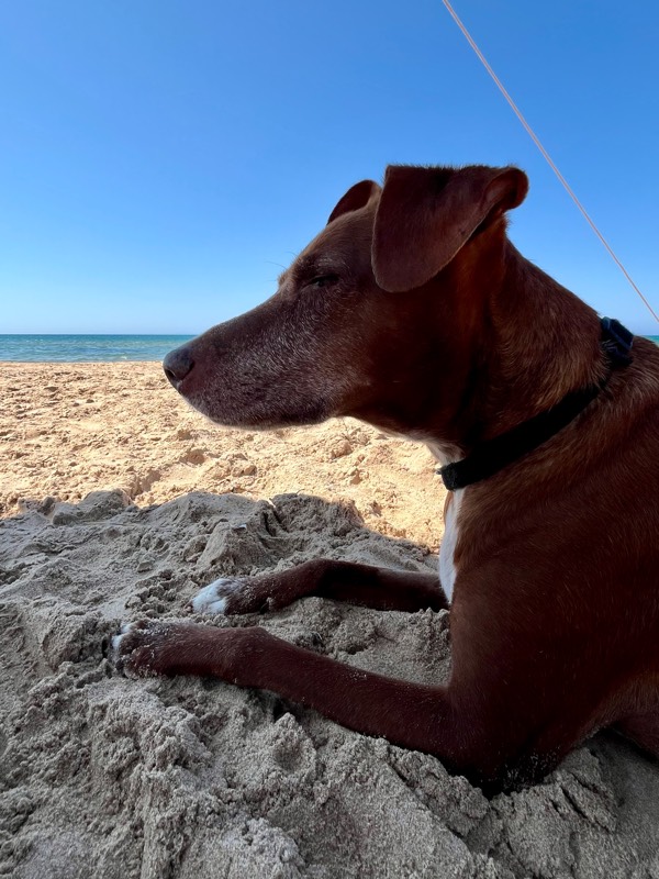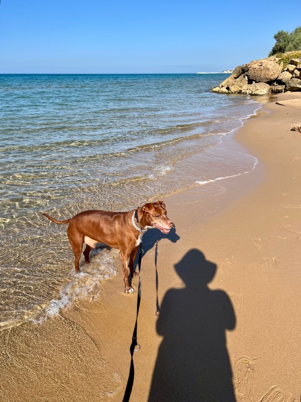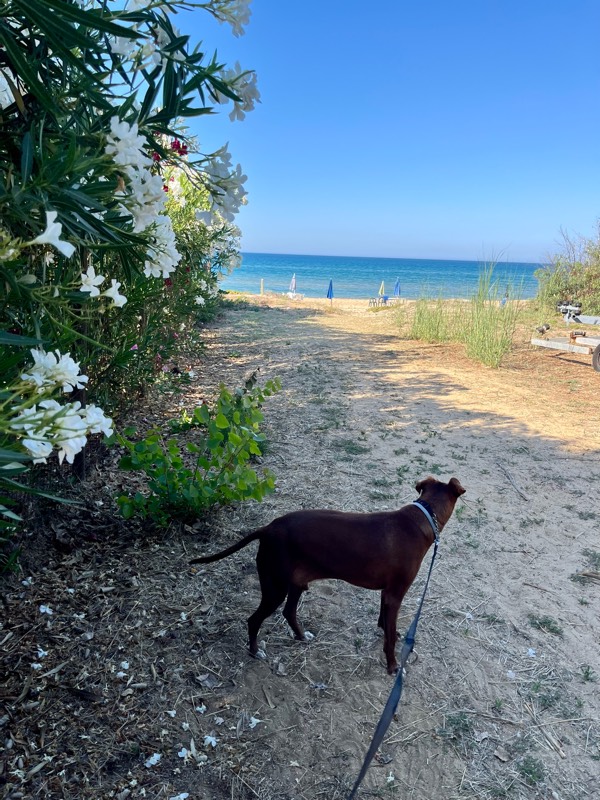 シチリアの各地にビーチエリアには、海に向かってフォーク状に細い通りが建設され、その通り沿いに別荘が建てられてるケースが多々あります。いくつか別荘が立ち並ぶその通りの先は、海(で行き止まり)。人通りがほとんどなく、他のワンコにも遭遇せず、刺激の少ないw快適ボン散歩となりました。