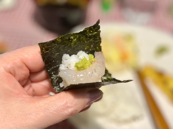 ”甘エビ青い卵を乗せ、ワサビ醬油で”と”カルパッチョ”の日伊メニューにしてみましたよー。
